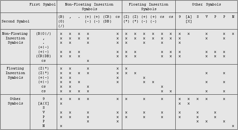 Floating insertion editing is indicated in a PICTURE character-string by using a string of at least two of the floating insertion characters. This string of floating insertion characters may contain any of the simple insertion characters or have simple insertion characters immediately to the right of this string. These simple insertion characters are part of the floating string. When the floating insertion character is the currency symbol, this string of floating insertion characters may have the fixed insertion characters 'CR' and 'DB' immediately to the right of this string.