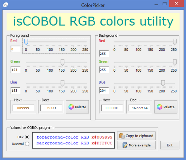 The Color Picker (CPK) utility allows to easily calculate color values to be used by COBOL programs.