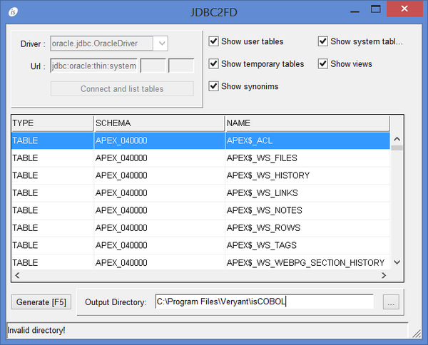 JDBC2FD The JDBC2FD utility generates file description copybooks from database tables. GUI Usage: jdbc2fd Select the JDBC Driver (or type it if it doesn’t appear in the list) and type the JDBC Url, then click “Connect and list tables” to obtain the list of the tables. The Url field is divided into three subfields: the first one contains the base url while the others allow you to specify the username and password. You can compile all the fields or provide a full url in the first and leave the other two blank. Results can be filtered using the check-boxes on the right. Choose the output directory for the copyfiles that will be generated, select the desired table and click the “Generate” button or press F5 to generate copybooks. Command-line Usage: jdbc2fd tableName [outputDirectory] JDBC settings are retrieved by the iscobol.jdbc.driver and iscobol.jdbc.url configuration properties. If outputDirectory is omitted, the current directory is used. Three copybooks are generated for each table. tableName.sl SELECT statement for FILE-CONTROL paragraph. tableName.fd File description entry and include of the below copybook tableName.wrk Record description Thin Client JDBC2FD can be used in thin client environment as well. Use this command to start it: iscclient -hostname <server-ip> -port <server-port> -utility jdbc2fd <arguments> The JDBC driver must be available in the server Classpath and copy files are generated on the server machine.