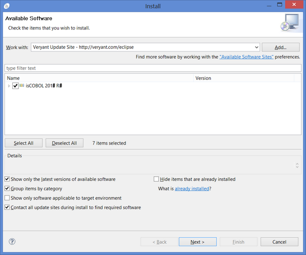2. Click on the Add… buttonBy filling the Location field with "http://veryant.com/eclipse" you obtain the latest IDE release. In order to download previous releases, use this kind of url instead: "http://veryant.com/eclipse/older/v<version>". For example, in order to download isCOBOL IDE 2016 R1, use "http://veryant.com/eclipse/older/v2016R1".