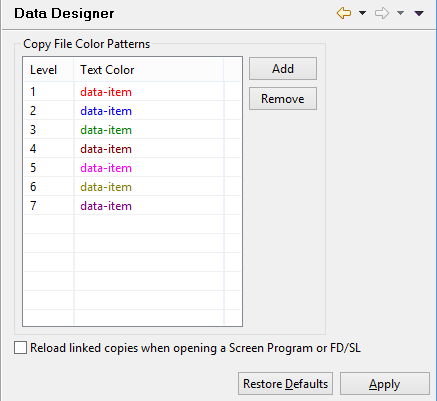 Setting Data Designer options Preferences: isCOBOL -> Data Designer When you import or link a copy file in the graphical Linkage Section, Working-Storage or File Designer, the content of the copy file is colored to easily distinghish it from the rest of the data items. Nested copy files are colored with different colors. This panel allows to configure these colors. After a copy file has been linked, if the user changes it with external editors, the IDE is not aware of the changes. You have to right click on the copy file and choose "Reload" in order to make the IDE aware of the changes. An alternate solution is to check the option "Reload linked copies when opening a Screen Program or FD/SL". In this way the IDE automatically reloads all the linked copy file each time you open the Screen Program or the FD in Structural or Data view respectively.