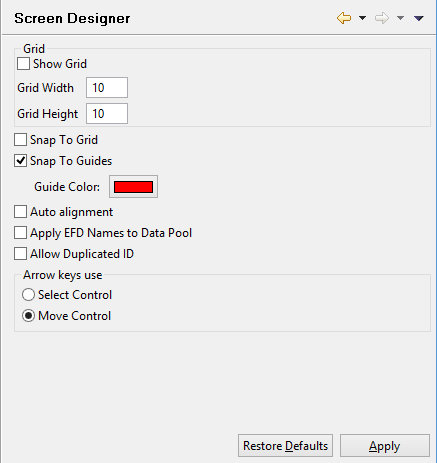Setting Screen Designer preferences Preferences: isCOBOL -> Screen Designer The Screen Designer panel allows you to enable and configure the grid on the background of each screen you draw. When you create a screen using the IDE, a grid made of dotted lines can be shown on the background to help you in placing and aligning the graphical controls. From this panel you can configure the size of the grid cells in pixels and you can activate the ‘Snap To Grid’ feature to make the IDE automatically align controls to cell boundaries. Another feature that allows you to easily align controls is the ‘Snap To Guides’. With this feature enabled, when you drag a control over the screen, guide lines will be shown on the X and Y axes allowing you to check if the current control position is on the same line or column of other controls. From this panel you can also configure the behavior of arrow keys on selected controls. By default, if you select a control on the screen designer and then press arrow keys, the control is moved. You can change this behavior in order to use the arrow keys to switch the selection to another control.