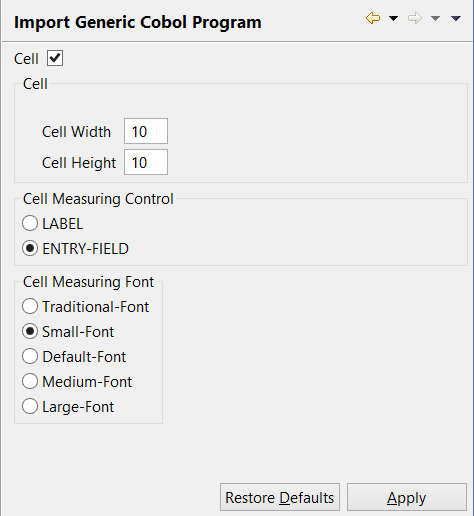 In this dialog it’s possible to specify the cell measurement approach to be used when a generic COBOL program with Screen Section is imported in the IDE. See Importing a Program with Screen Section for further details about importing programs with Screen Section in the IDE.