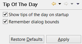 Configuring the Tip Of The Day Feature Preferences: isCOBOL -> Tip Of The Day isCOBOL IDE shows tips at startup. This behavior can be configured in the “Tip Of The Day” panel.