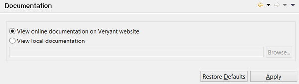 The “Documentation” panel allows you to choose which isCOBOL Documentation will be open from inside the IDE when you select Open isCOBOL Documentation in the Help menu. By default the IDE opens the online documentation available on Veryant’s website, which is the most up to date, however you can make it link to a local copy of the isCOBOL documentation if you prefer.