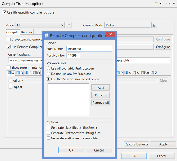 5. click on the Configure button and input the necessary informationHost Name and Port are the address and the port of the server where the Remote Compiler is listening. PreProcessors Names is the list of preprocessors that must be invoked to precompile the source file (click on the Add button to add items to the list). Remaining settings are optional.