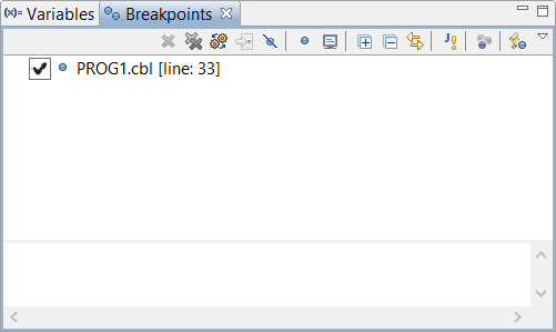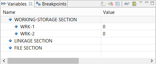 Debug Perspective A better interface for the debug process is offered by the Debug Perspective. To switch to the Debug Perspective: • click on the Window menu • choose Open Perspective • choose Debug The Debug Perspective contains two views that allow you to manage Variables and Breakpoints. The Variables view allows the user to monitor the content of variables. The Breakpoints view allows the user to toggle breakpoints and monitors. When the debugging session terminates, the IDE switches back to the isCOBOL perspective.