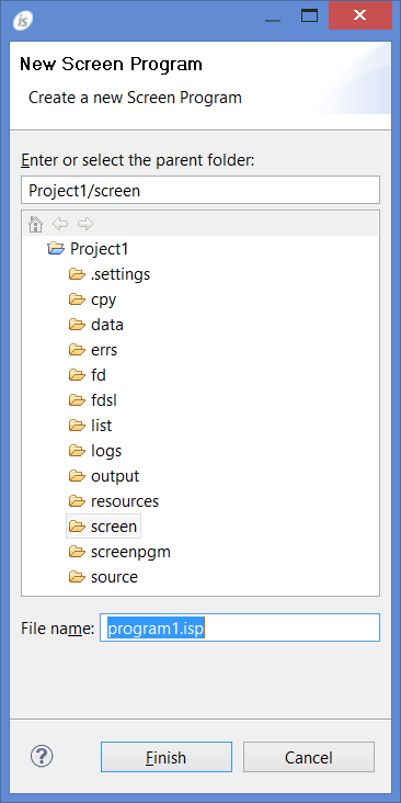 To create a new Screen Program, right click on the project name in the isCOBOL Explorer area and choose New / Screen Program from the pop-up menu. The IDE will ask for program name. Ensure that the name terminates with the .isp extension and that it’s placed in the screen folder of the project.