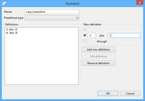 • Click on the Up and Down buttons to move the selected alphabet up or down in the list controlling the order alphabets will appear in the program Special-NamesAdd and Edit open a dialog where you can provide the alphabet name and the alphabet definitions. The screenshot below shows a work in progress case insensitive alphabet.
