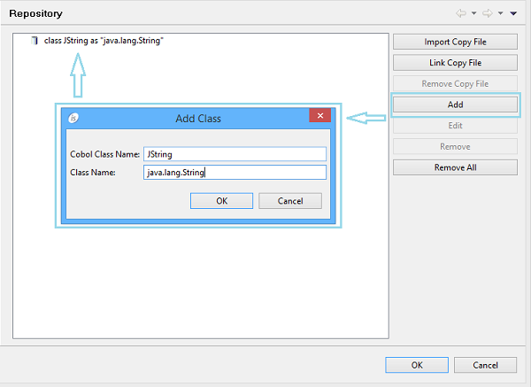 • Select Repository from the list.To add classes, click on the Add button and provide both a logical name and full class name. The class will be searched for in the project Class Path (see Class Path for more information). If not found, the IDE shows a red ‘class not found’ message above the fields.