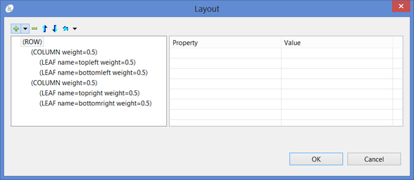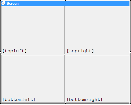 How to create docking windows It’s possible to create docking windows with the IDE by following these steps: 1. Click on the Screen title bar in order to load screen properties in the Property View. 2. Set the property "window type" to "DOCKING". 3. Right click on the Screen title bar and select "Docking Window Layout" from the pop-up menu. The Layout editor is open. Use the buttons at the top to create ROWS, COLUMNS and LEAFS. Provide a name and a weight for each item. The following screenshot, for example, shows a layout made of 4 different dockable windows where each dockable window takes a quarter of the docking window. The above settings will make the Screen look like this in the Screen Designer. 4. Create a new Screen 5. Select the new Screen and set the property “window type” to "DOCKABLE". 6. Set the property "upon leaf" to one of the leafs defined in point 3. 7. Draw controls on the Screen and code their procedures. 8. Repeat from step 4 for each dockable window that you want to add to the docking window.