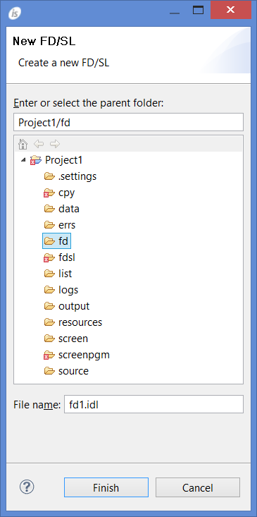 To create a new File Layout, right click on the project name in the isCOBOL Explorer area and choose New / FD/SL from the pop-up menu. The IDE will ask for fd name. Ensure that the name terminates with the .idl extension and that it’s placed in the fd folder of the project.