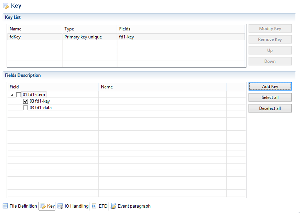 Key Definition To add a new key to the file: 1. select the fields that will be part of the key from the Fields Description. Double click in the Name column in order to display possible field name extensions. 2. click on the “Add Key” button 3. Edit the columns of the Key List to set key name and type 4. When more than one key has been defined, use “Up” and “Down” buttons to change the keys definition order