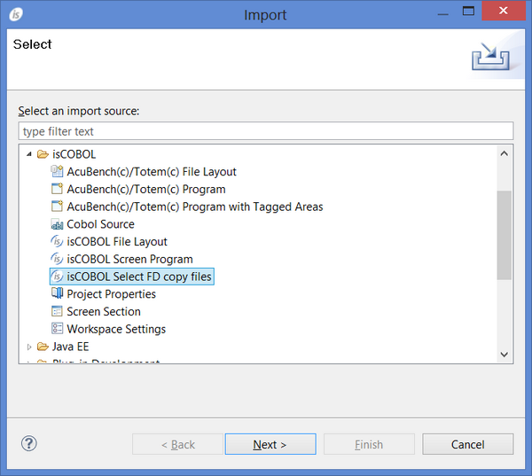 Generating File Layouts from Existing Copybooks isCOBOL IDE is able to generate a File Layout by importing existing fd and sl copybooks. 1. Right click on the project name in the isCOBOL Explorer area. 2. Choose Import from the pop-up menu. 3. Choose isCOBOL / isCOBOL Select FD copy files from the tree. 4. Browse to find the folder containing the copybooks, check the ones that you wish to import and click Finish. 5. The files will appear between your FDs.