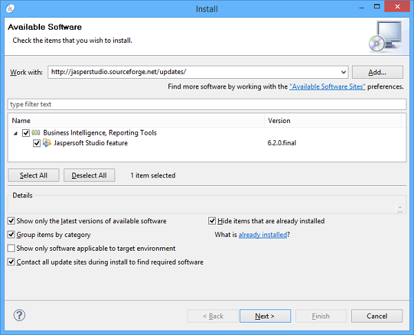 2. fill the Work with: field with the following update site url: http://jasperstudio.sourceforge.net/updates/