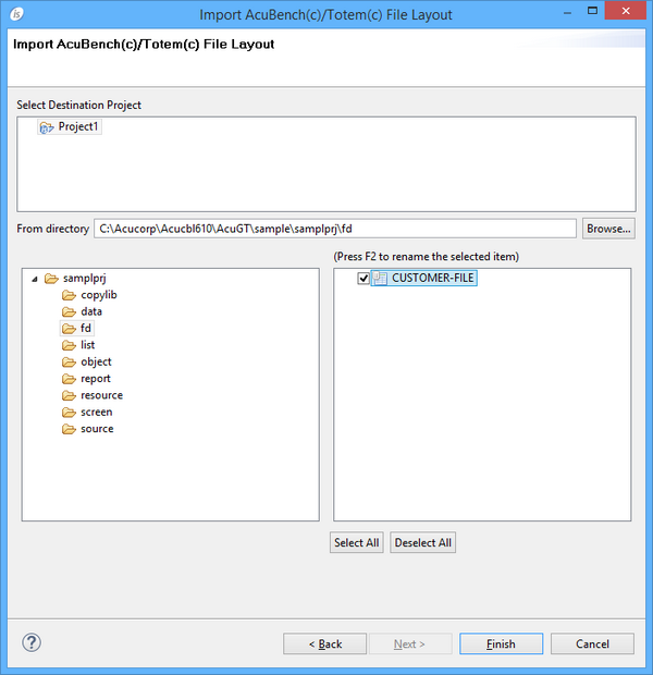 Importing a Data Layout from AcuBench To import an AcuBench Data Layout: 1. Right click on the project name in the isCOBOL Explorer area. 2. Choose Import from the pop-up menu. 3. Choose isCOBOL / AcuBench(c)/Totem(c) File Layout from the tree. 4. Browse to find the dlt files, check the ones that you wish to import and click Finish. 5. The file will appear between your FDs.
