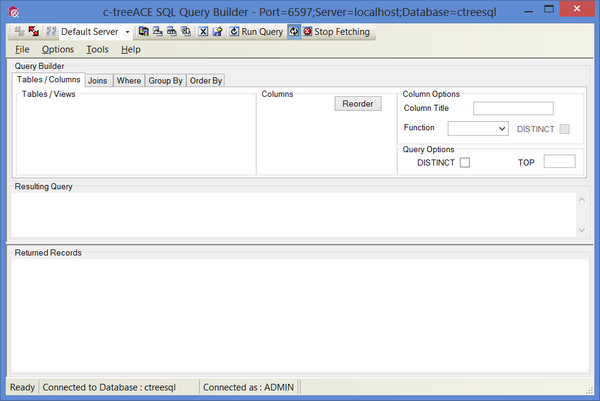 3. Optionally switch to the pages Joins, Where, Group By and Order By to specify additional options and criteria.The SQL query is updated in the Resulting Query field in real time.The results of the query are updated in the Resulting Records field in real time.