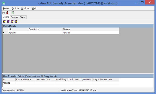 c-treeSecurityAdmin c-treeSecurityAdmin is a graphical utility provided for the Windows platform. It manages the users and permissions through a graphical window composed of multiple panels. ctreeSecurityAdmin allows to: • Add, Delete and Modify Users • Change User Passwords • Create, Modify and Delete Groups • Modify File Security Attributes • Change File Passwords Refer to c-tree Server Administrator's Guide for additional information on this utility.