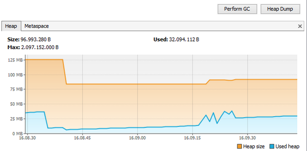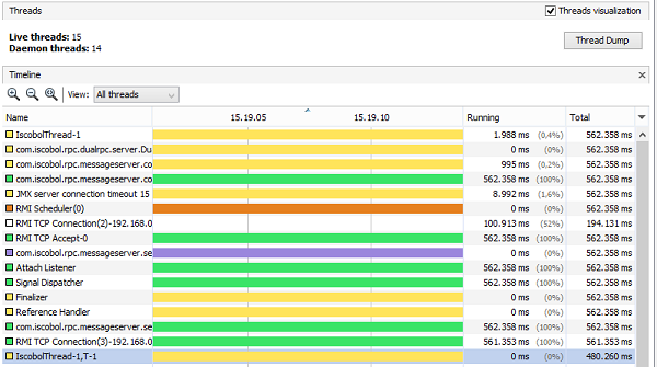 Tuning and monitoring isCOBOL Server with JvisualVM JvisualVM is a Java virtual machine monitoring, troubleshooting, and profiling tool. It's installed along with the Java Development Kit (JDK). In this chapter we're going to see how to monitor the isCOBOL Server activity and the load using JvisualVM. The JvisualVM executable file is found in the JDK bin directory. Launching JvisualVM and attaching the isCOBOL Server process When JvisualVM starts, it lists all the Java applications running on the local machine along with their PID. You should find the isCOBOL Server among these applications. The name of the application changes depending on the command that you used to start the isCOBOL Server. command application name shown by JvisualVM iscserver.exe (Windows) C:.Program Windows service Local Application iscserver (Linux/Unix) com.iscobol.as.AppServerImpl java com.iscobol.as.AppServerImpl com.iscobol.as.AppServerImpl In order to monitor the isCOBOL Server process, you have to attach it. Just double click on the application name in the tree or right click on it and choose "Open" from the pop-up menu. Note - the process may not appear in the list if: • the JDK version from which you started JvisualVM is different than the Java version used by isCOBOL Server • only on Windows, JvisualVM was launched with different Administrator privileges than isCOBOL Server. Connecting to a remote isCOBOL Server process Sometimes it’s not possible to start JvisualVM on the same machine where isCOBOL Server is running. In this case you have to set up a remote JMX connection. The most common case is where the server is a Linux/Unix box where no graphical desktop is available, so in this guide we’re going to see how to set up the JMX connection on Linux and how to attach it from a Windows client. Assume that the IP address of the Linux server is 192.168.0.130. First of all, we need to dedicate a port to the JMX connection. In this example, we’re using port 3333. Change the isCOBOL Server startup command as follows: iscserver -J-Dcom.sun.management.jmxremote.port=3333 \ -J-Dcom.sun.management.jmxremote.ssl=false \ -J-Dcom.sun.management.jmxremote.authenticate=false \ -J-Djava.rmi.server.hostname=192.168.0.130 After the isCOBOL Server has been started, • run JvisualVM on a Windows machine in the same network as your Linux server • right click on "Remote" in the Applications tree and choose "Add Remote Host..." • fill the "Host name" field with the IP address of the Linux server and click OK • the IP address appears as child item of Remote in the tree. Right click on it and choose "Add JMX Connection..." • in the "Connection" field, put the port number 3333 after the colon and click OK. • the isCOBOL Server application will appear as a new child in the tree: In order to monitor the isCOBOL Server process, you have to attach it. Just double click on the application name in the tree or right click on it and choose "Open" from the pop-up menu. JvisualVM’s Monitor page The Monitor page allows to monitor in real time the CPU and memory usage of the whole isCOBOL Server as well as the number of loaded classes and active threads. You should pay particular attention to the Heap monitor. The Heap is the amount of RAM memory that is used to store resources pointed by COBOL handles like bitmaps, fonts, ESQL cursors, etcetera. This memory has an initial size that can be configured through the -Xms Java option and a maximum size that can be configured through the -Xmx Java option. The Heap usage increases when the COBOL application loads a new resource and decreases when a garbage collection is performed. The garbage collection is a procedure that takes care of removing inactive resources (e.g. a font or a bitmap whose handle has been destroyed) from the Heap memory. This procedure is automatically triggered by the JVM when the Heap usage is near the maximum amount of memory available or when the JVM is idle. You can force a garbage collection from the JvisualVM screen by clicking the "Perform GC" button. Be aware that this procedure consumes CPU and it may slow down connected clients that are working. The "Heap Dump" button allows to take a snapshot of the Heap in a given moment. By analyzing this snapshot you can find out which classes are using most of the memory. JvisualVM’s Threads page The Threads page lists all the threads that were created in the isCOBOL Server’s JVM. By default all threads are shown, including the ones that are no more running. You can filter the list using the "View" combo-box on top of the list. The list includes a timeline that shows how the threads state changes as time goes by. There are five possible states: Sate Meaning Running The thread is running. In a COBOL application this is the typical state during a elaboration like a cycle that reads records from a file and processes them. Sleeping The thread is sleeping. In a COBOL application this is the typical state of a program that called the C$SLEEP routine and is waiting for the call to return. Wait The thread was blocked by a mutex or a barrier, and is waiting for another thread to release the lock. In a COBOL application this is the typical state of a program that is accepting user input with an ACCEPT statement. Park Parked threads are suspended until they are given a permit. Monitor The thread is waiting on a condition to become true to resume execution. The isCOBOL Clients connected to the isCOBOL Server can be identified by their name: IscobolThread-# This is the main thread of the isCOBOL Client. # is the thread ID (TID) assigned to that Client. You can retrieve more information about the Client whose thread ID is # by running the isCOBOL Server’s administration panel. IscobolThread-#,T# This is a COBOL thread started from the COBOL application using either CALL THREAD or PERFORM THREAD statements. The first # is the TID of the Client, while the second # is a progressive number assigned by the isCOBOL Fram