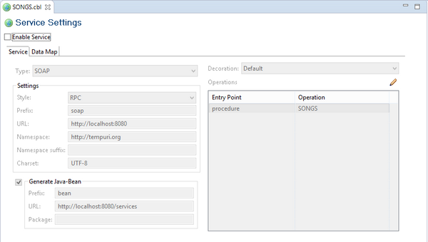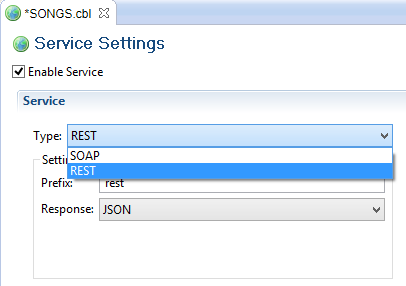 • Choose isCOBOL EIS ApplicationWe’ve just demonstrated how to create a SOAP Web Service. With the next step, we’re going to generate a REST Web Service instead. To achieve it, return to the Service Editor and change the field Type from SOAP to REST.Note - By switching the Type value, the Settings frame content changes, allowing to set only the settings that are suitable for the selected service type.After it, save modification and recompile SONGS.cbl to obtain the following new item in the project source folder: