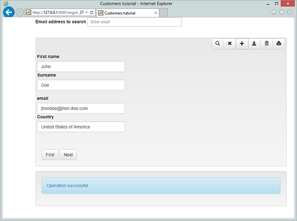 Next, we need to bind the page, or a section of a page, to a controller. In this sample we bind the CustomerCtrl (Customer Controller) to a div, this means that each control inside the div will have access to the model and methods defined in the controller. The binding is done using the directive