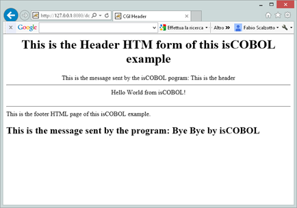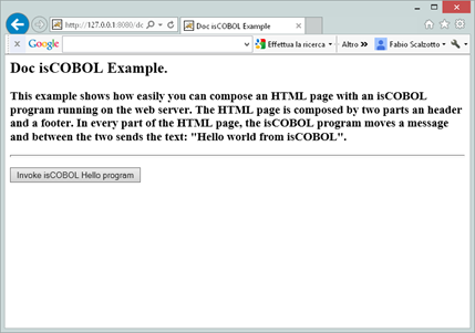 <H2>Doc isCOBOL Example.</H2><H3>This example shows how easily you can compose an HTML page with an isCOBOL program running on the web server. The HTML page is composed by two parts an header and a footer. In every part of the HTML page, the isCOBOL program moves a message and between the two sends the text: "Hello world from isCOBOL".</H3>