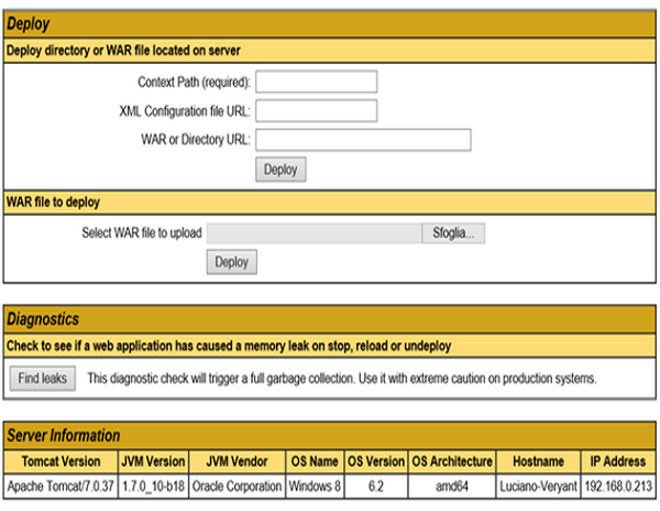 Download Tomcat from http://tomcat.apache.org/ and install it, if you haven't installed it yet. Start the Tomcat service.Select Tomcat Manager link in order to application administration pages. You will be prompted for username and password. By default Tomcat has the user "admin" with no password. You can refer to tomcat-users.xml.Using the Tomcat Web Application Manager, scroll down to the Deploy dialog and use the Browse button to select the Web Application Archive file (wd2.war)