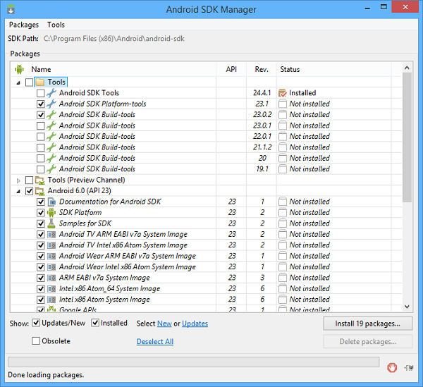 The below instructions explain how to download and install the SDK on Windows. For information on how to install the SDK on other platforms, refer to the official site http://developer.android.com.In order to download the Android SDK, navigate to http://developer.android.com/sdk/index.html and scroll down to “Get just the command line tools”. Choose the proper zip file according to the platform where you’re going to develop. Aaccept the terms and conditions, then proceed with the download.Once the download is complete, unzip the archive in a folder of your choice, for example on Windows you could unzip it under C:\AndroidSDK and you obtain C:\AndroidSDK\tools. Run the android command (android.bat) within the tools folder in order to start the SDK manager.By default the SDK Manager allows to install the latest platform tools, system image and USB driver, but you can install also previous versions as well as additional resources. Mark the items that you wish to install, then click on the Install packages... button.At the end of the installation, you will find a new folder named platform-tools at the same level of tools.Once the Android SDK has been installed, add the tools and platform-tools directories of Android’s SDK to the PATH environment variable in order to be able to run android commands from the command line.
