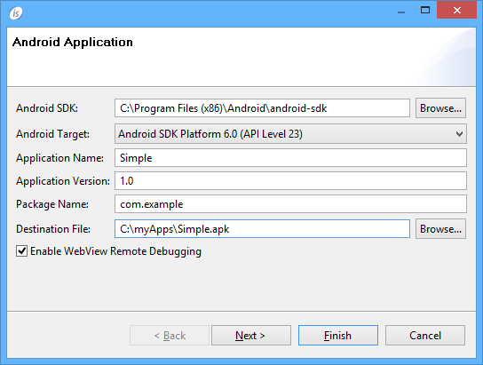 3. Note - Do not use the same package for more applications. The package is a sort of unique ID in the Android system.The "Enable WebView Remote Debugging" option enables the ability to attach the app with a Chrome browser in order to debug the HTML/JS frontend as described here.